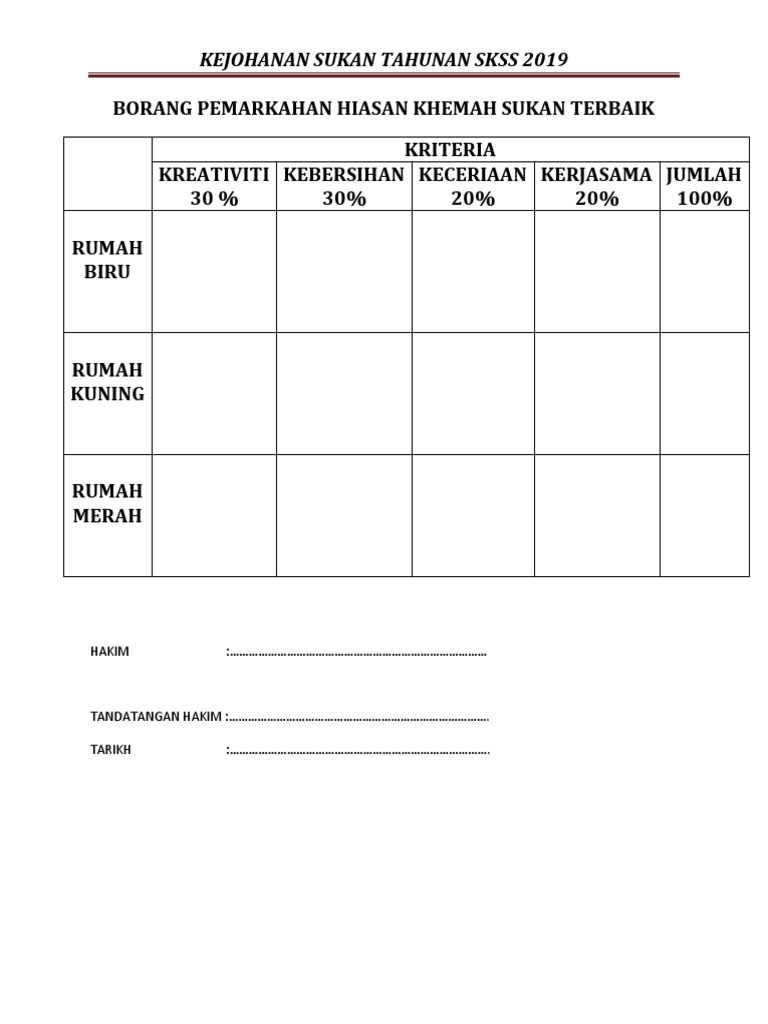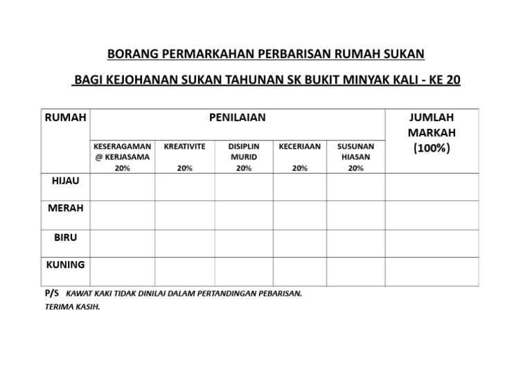 Borang Pemarkahan Perbarisan Rumah Sukan - Borang pemarkahan pertandingan perbarisan antara rumah sukan sekolah kebangsaan pekan kota belud sabah.. Aspek pemarkahan pasukan rumah alza saga wira waja pembawa bendera & sepanduk ( 10 markah ) disiplin ( 20 markah ) pakaian hiasan. Borang pemarkahan pertandingan perbarisan antara rumah sukan sekolah kebangsaan pekan kota belud sabah. Documents similar to borang pemarkahan pertandingan perbarisan rumah sukan.doc. Video ini memaparkan perbarisan rumah sukan nilam pada kejohanan olahraga kali ke 24 sekolah kebangsaan muhibbah. Sokongan membantu dari segi menjayakan aktiviti kelab sukan dan aktiviti sukan sekolah (atau yang seumpama.