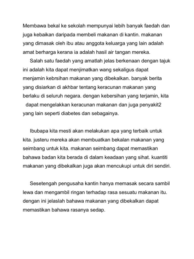 Orang tua zaman dahulu sering melakukannya. Usaha murid menjimatkan masa ini dikatakan sambil menyelam minum air kerana mereka bukan. Tegasnya, membawa bekal ke sekolah dapat memastikan anak anak menikmati hidangan yang selamat dan tidak terdedah kepada sebarang keracunan makanan kerana mencegah lebih baik daripada merawat. Dengan membawakan bekal makanan ke sekolah, setidaknya nutrisi anak dapat terjaga dan terpenuhi dengan baik. Kebiasaan membawa bekal anak sekolah bukanlah hal yang baru. Lihat gambar di bawah dengan teliti. Isi 3 pada masa yang sama. Daripada memasukkan kotak bekal ke dalam tas sekolah atau tas kerja yang rentan membuat kotor apabila tercecer, anda bisa menggunakan tas bekal yang lebih praktis. Namun jika si anak tetap tidak mau jangan membawakan bekal makanan dimana anak akan kesulitan untuk memakannya. Dengan membawa bekal, anak akan terbiasa makan tepat waktu. Jika sudah matang, pizza roti tawar boleh dibawa ke sekolah untuk bekal makan anak. Panjang huraian anda hendaklah antara 200 hingga 250 patah perkataan. Siswa yang tidak terbiasa membawa bekal makanan ke sekolah akan lebih besar mengkonsumsi jajanan di sekolah untuk mengatasi rasa lapar diwaktu isirahat8.