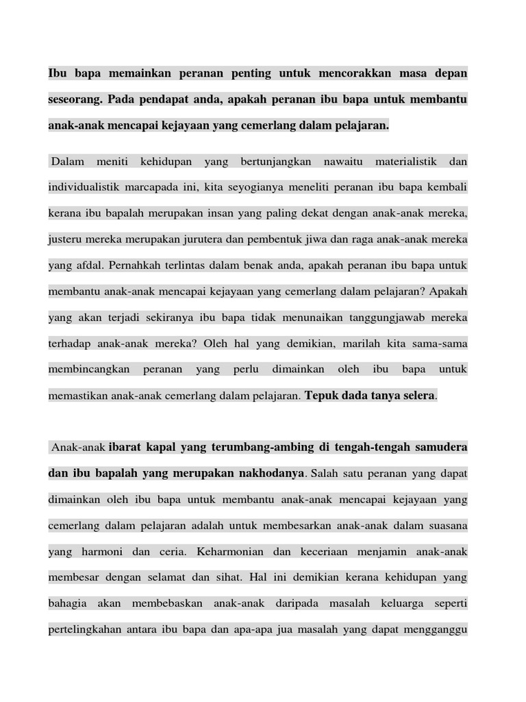 Karangan bertajuk peranan ibu bapa dalam memupuk semangat membaca dalam kalangan remaja. Ibu bapa dah tak perlu risau. Sikap sesetengah ibu bapa yang hanya sibuk mengejar harta kekayaan perlulah dikikis sama sekali. Kejayaan team maf empire jutawan shaklee. Ibaratnya seperti sehelai kain putih, ibu bapalah yang bertanggungjawab untuk.